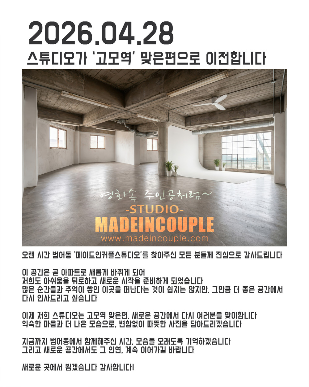 »çÀü¿¹¾àÁ¦ ½ºÆ©µð¿À ¹æ¹®Àü ÃÖ¼Ò ÇÏ·ç Àü ¿¹¾àÈÄ ¹æ¹®ÇØÁÖ¼¼¿ä after.°í¸ðµ¿ (2026.4.28 ~ ) . . . ±×µ¿¾È ¹ü¾îµ¿ ÁÖÅð¡ °ñ¸ñ¿¡ À§Ä¡ÇØ ÁÖÂ÷·Î ¸¹Àº ¾Ö·Î»çÇ×ÀÌ ÀÖ¾î¼ °í¹Î ³¡¿¡ ÁÖÂ÷°ø°£ È®º¸¸¦ À§ÇØ µµ½É¿¡¼ ¾à°£ ÀÌÅ»ÇÏ¿´½À´Ï´Ù ¹ü¾îµ¿ ¸ÞÀ̵åÀÎÄ¿Çà ½ºÆ©µð¿À ±âÁØÀ¸·Î ÀÚÂ÷·Î ¿À½Ã¸é 15ºÐ °Å¸®·Î °í¸ð¿ª ¸ÂÀºÆíÀ̶ó °í¸ð¿ª ¹®È¼¾ÅÍ ÀÚü 50´ë ¼ö¿ë °¡´ÉÇϸç ÀúÈñ °ø°£Àº 4´ë Á¤µµ ÁÖÂ÷°ø°£À» È®º¸ÇØ ÀÖ½À´Ï´Ù ´Ü ´ëÁß±³ÅëÀº '¼ö¼º 2¹ø' ¹ö½º¸¸ ´Üµ¶³ë¼± ¿îÇà ÁßÀ̶ó ¸ÞÀ̵åÀÎÄ¿ÇýºÆ©µð¿À´Â °í¸ð¿ª°ú ÇÔ²² ¾Æ¸§´Ù¿î °í¸ð¿ª ÁÖº¯À» ¾Ë¸®¸ç ¹ö½º ¿îÇà ³ë¼± ¹× ±âŸ ´ëÁß±³Åë È®º¸¸¦ À§ÇØ ³ë·ÂÇϰڽÀ´Ï´Ù . . . . .